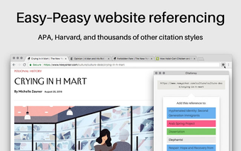 Citationsy is een gebruiksvriendelijke tool voor het citeren van verschillende bronnen zoals websites, boeken, artikelen en meer. Deze Firefox-extensie biedt de mogelijkheid om met één klik perfect geciteerde referenties en voetnoten te maken in verschillende stijlen, waaronder APA, Harvard en MLA. Het is een uitstekende keuze voor studenten en professionals die op zoek zijn naar een betrouwbare manier om hun bronnen te beheren en te citeren.
